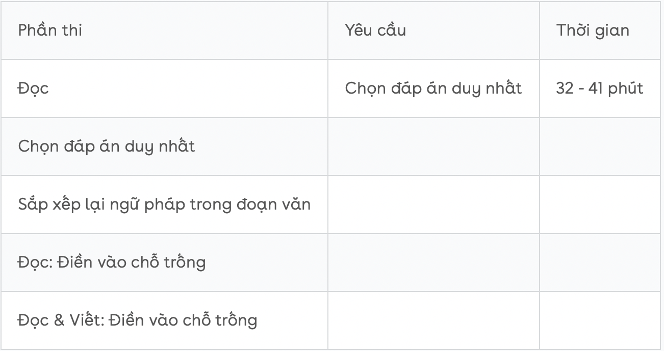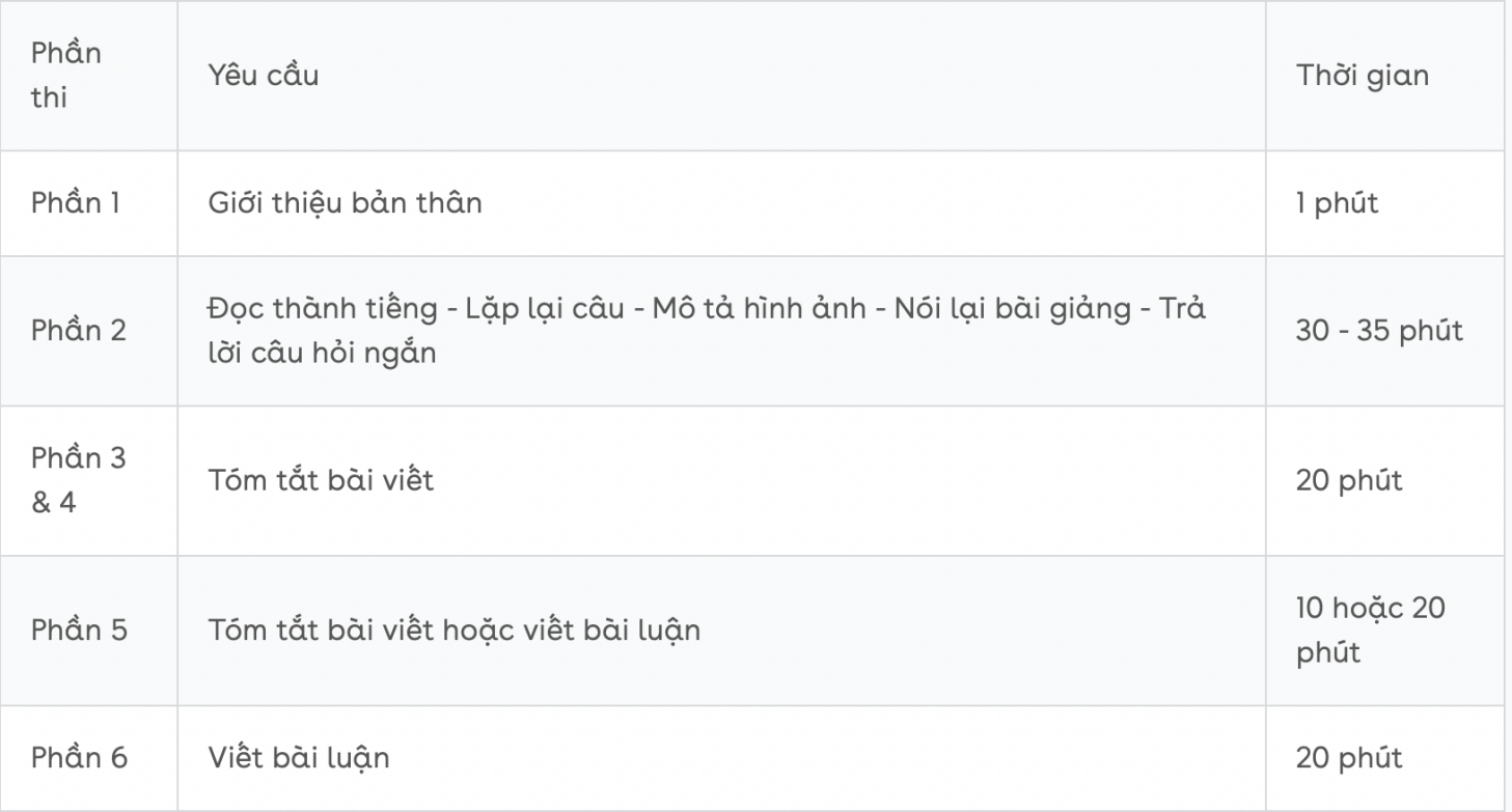 Bài kiểm tra có 4 kỹ năng: Nghe, Nói, Viết & Đọc kéo dài trong 2 giờ.