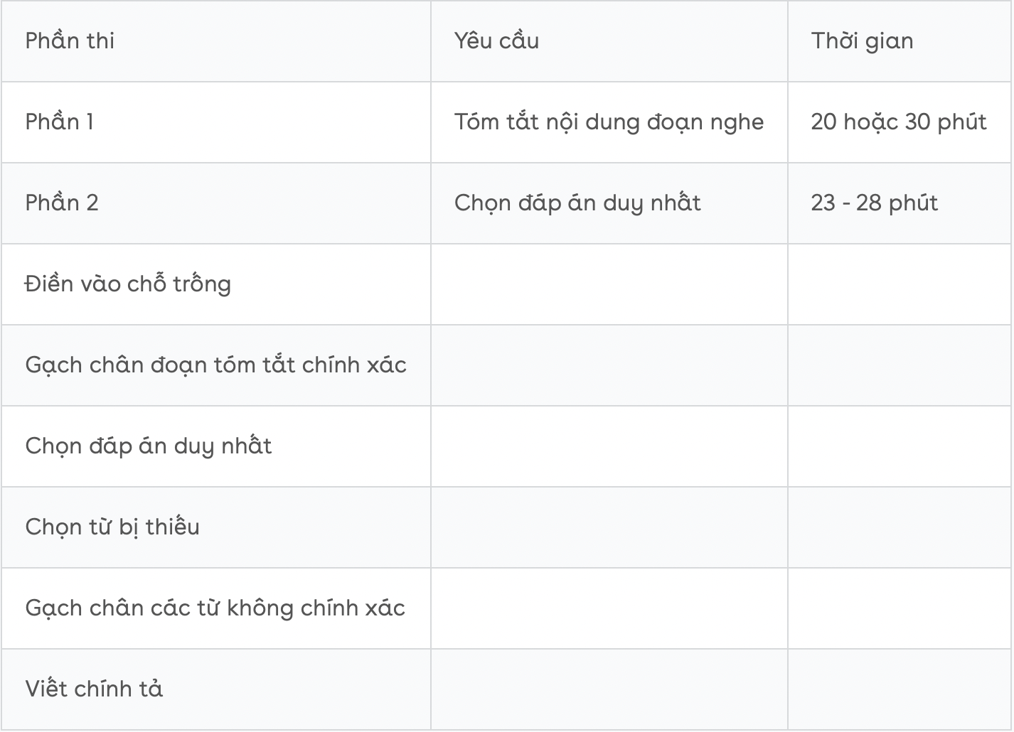 Các câu hỏi dựa trên các đoạn âm thanh hoặc video, bắt đầu phát tự động. Bạn nghe mỗi đoạn âm thanh hoặc video một lần. Bạn được phép ghi chép.